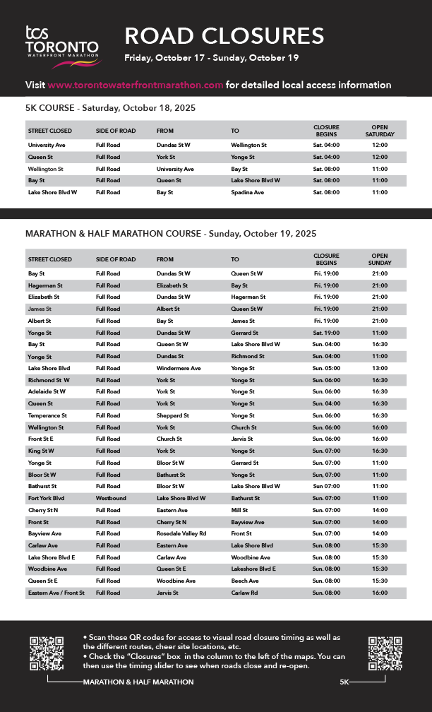 At 9:00am Bay St will close to east/west pedestrian traffic from Lake Shore Blvd to Dundas St. Marathon and Half Marathon spectators can cross Bay St at Dundas or use the pedestrian bridge just south of Front St. inside Union Station. We strongly recommend that you take public transit to the race.