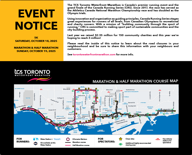 8:00 a.m. | Marathon and Half Marathon Start | On Yonge St., near Elm St., facing northbound |